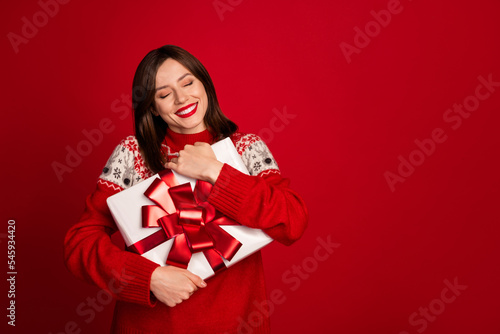 © deagreez, Fototapeta premium Portrait of thankful funny positive woman bob hairdo dressed red sweater hug present box eyes closed isolated on red color background
