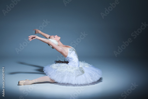 © master1305, Naklejka premium Portrait of the ballerina in ballet tatu on blue background