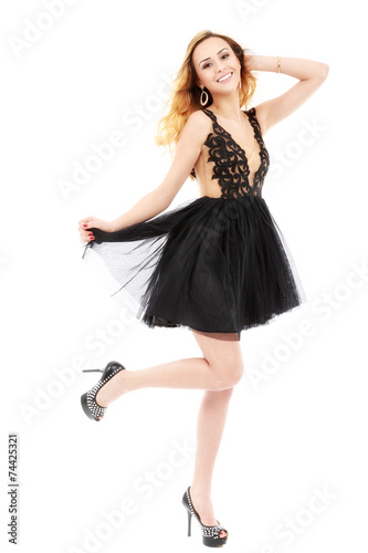 © czamfir, Naklejka premium Portrait of the beautiful blonde in black dress.