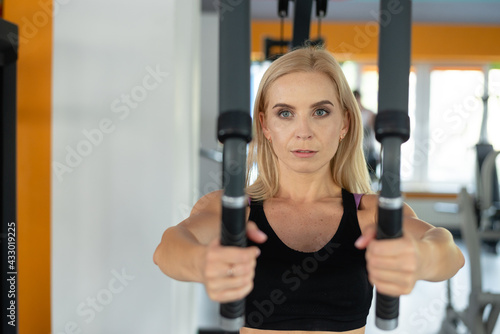 © Andrii Lysenko, Obraz premium Portrait of the blonde sportswoman and the reduction of hands in the simulator exercise and training of the woman athlete in the gym. Fit muscular girl sitting on a bench pumps up her body.
