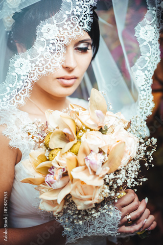 © andreiko, Naklejka premium Portrait of the bride with a veil. Wedding theme.