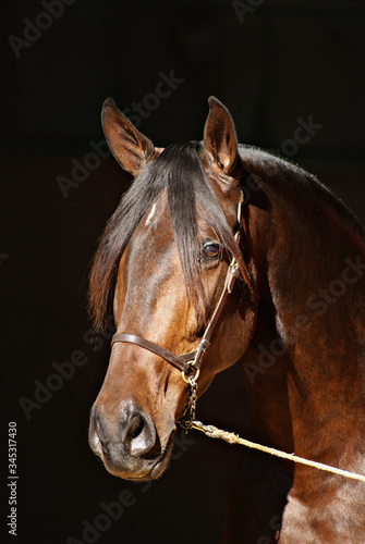 © Azahara, Obraz premium Portrait of the face of a shaved spanish mare with dark background