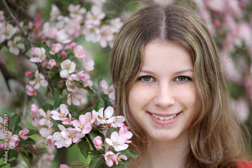 © jura, Fototapeta premium Portrait of the girl against a blossoming apple-tree