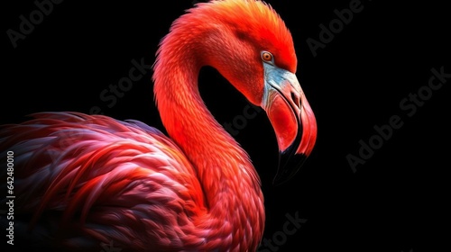 © Irina, Obraz premium Portrait of the pink flamingo bird. Dark background. Copy space.