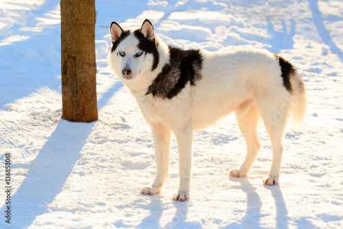 Naklejka premium Portrait of the Siberian Husky dog black and white color with blue eyes in winter.