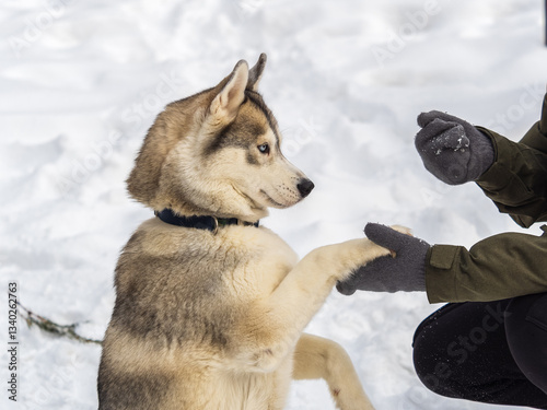 © Dmitrii Potashkin, Naklejka premium Portrait of the Siberian Husky dog black and white colour with blue eyes in winter.