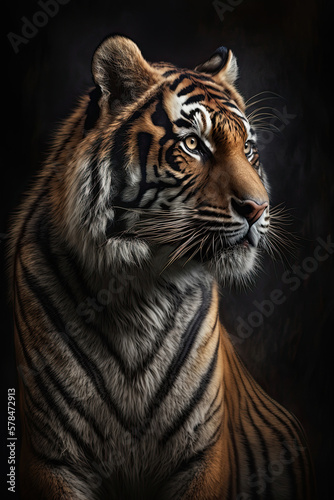 Fototapeta premium Portrait of the tiger on dark background. Ai generated illustration.