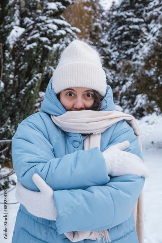 © phpetrunina14, Obraz premium portrait of the woman get frozen outdoors at cold winter day