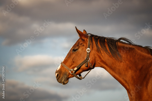Obraz premium Portrait of thoroughbred horse head against cloudy sky