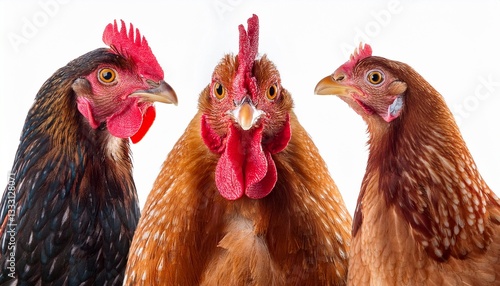 © Oliver, Naklejka premium portrait of three chickens closeup isolated on white background