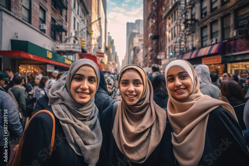 © Oier, Obraz premium Portrait of three muslim young women wearing brown hijab and smiling and looking at camera in new york city streets. Inclusion concept. Generative AI.