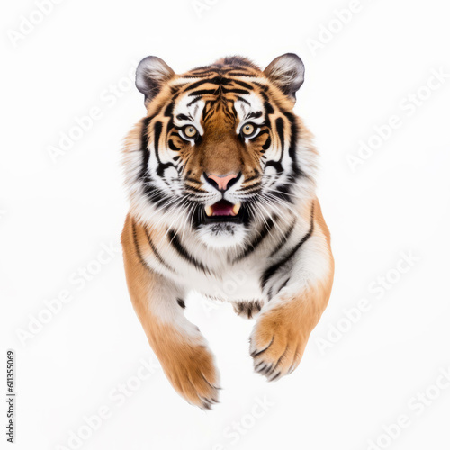 © tiero, Fototapeta premium portrait of tiger frontal view while jumping isolated on white.