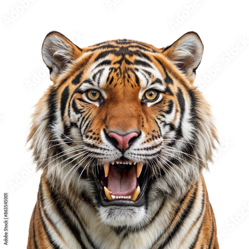 © whyt, Fototapeta premium Portrait of tiger roaring facing front isolated on transparent background