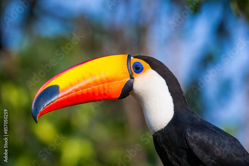 Naklejka premium Portrait of Toco toucan (Ramphastos toco) with a big colored beak. Close-up. Brazil. Pantanal.