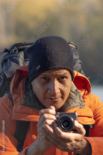 © Leonardo, Obraz premium Portrait of traveler man at lake in autumn taking a photo with the digital camera