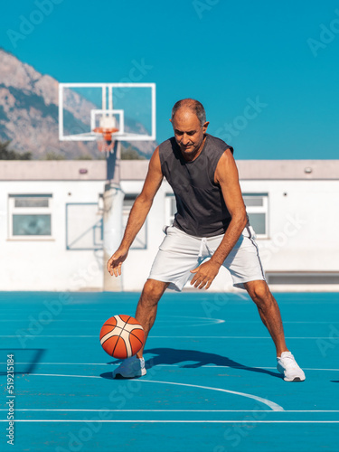 Fototapeta premium Portrait of Turkish Cypriot elderly athletic man having fun playing basketball with a cute dog jack russel terrier on blue color playground outdoor at summer sunny day