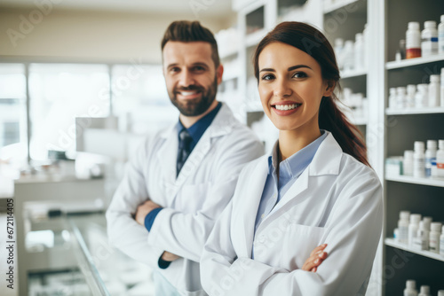 Obraz premium Portrait of two colleagues, working at the pharmacy