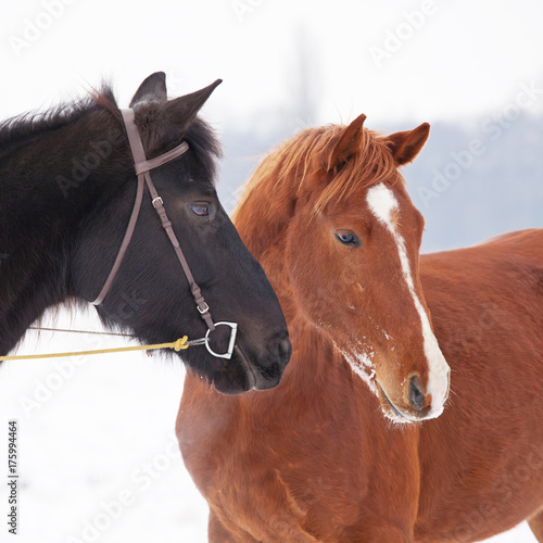© lenkadan, Fototapeta premium Portrait of two horses in winter landscape