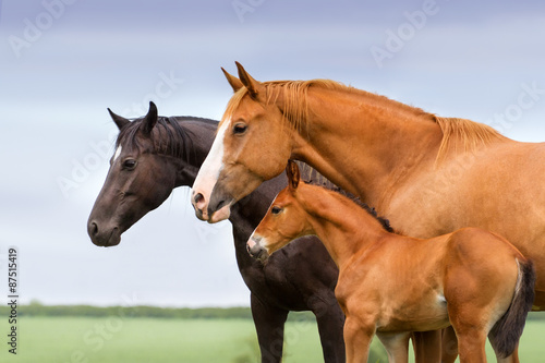 © callipso88, Fototapeta premium Portrait of two mares and foal at pasture