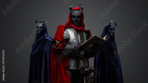 © Fxquadro, Naklejka premium Portrait of two members of mysterious cult and their chief with book.