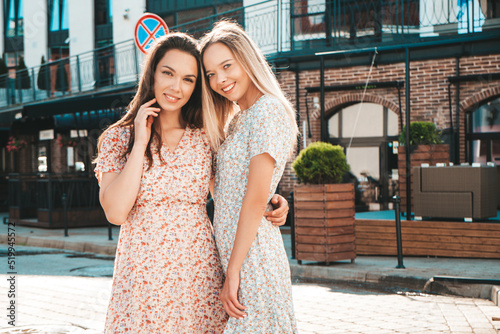Naklejka premium Portrait of two young beautiful smiling hipster female in trendy summer dress...