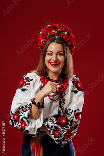 Fototapeta premium Portrait of ukrainian woman in traditional ethnic clothing and floral red...