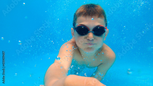 Naklejka premium Portrait of Underwater Boy Fun in the Swimming Pool with Goggles. Summer...