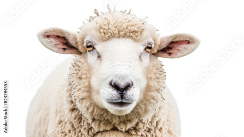 Fototapeta premium Portrait of white fluffy sheep on white background