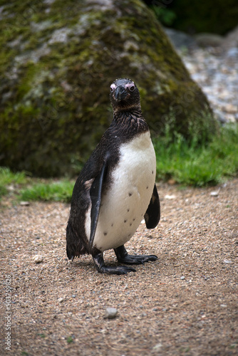 Fototapeta premium Portrait of wild penguin from south africa standing on the beach