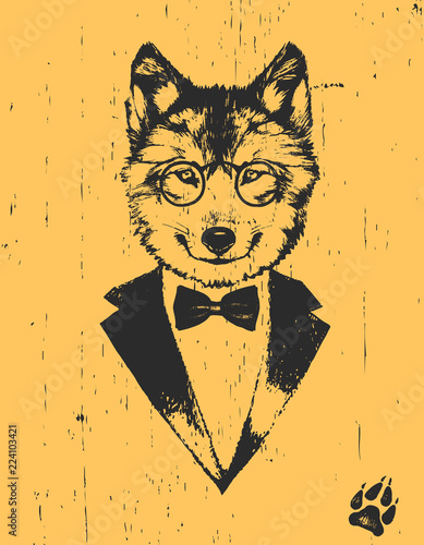 © Victoria Novak, Naklejka premium Portrait of Wolf in suit, hand-drawn illustration, vector