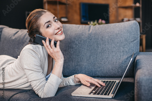Fototapeta premium Portrait of woman talking on smartphone and using laptop at home. Remote working concept