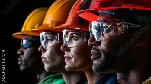 © Oulaphone, Fototapeta premium Portrait of workers wearing helmets in diverse group of team on construction site.