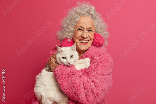 © WHstudio Leushin N, Obraz premium Portrait of wrinkled grandmother holds white cat on hands, stays at home during pandemic outbreak, wears fluffy earrings, soft robe, going to feed pet, isolated on pink background. Woman on pension