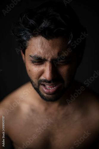 © abir, Fototapeta premium Portrait of young and handsome Indian Bengali brunette man in bare body crying loudly in black copy space background. Indian lifestyle and fashion photography