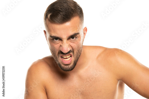 © vladimirfloyd, Fototapeta premium portrait of young angry shirtless man with beard, screaming on a white background