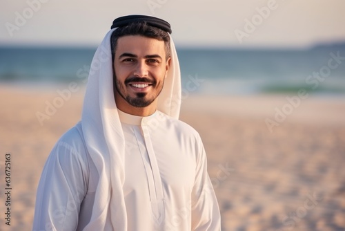 Fototapeta premium Portrait of young arabian man smiling at camera on the beach