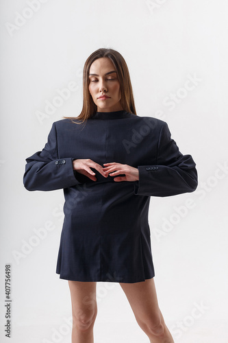 © Artem Zatsepilin, Fototapeta premium portrait of young attractive asian woman with long hair wearing blue suit on the contrary, isolated on white studio background. skinny pretty female posing on cyclorama. model tests of beautiful lady