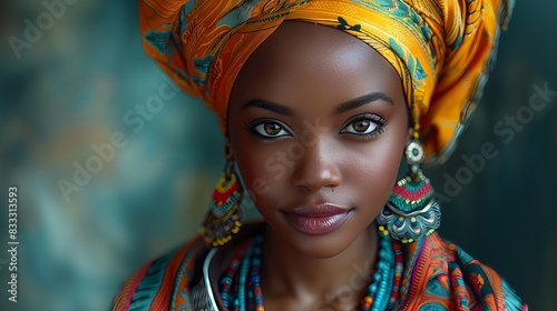Fototapeta premium Portrait of young beautiful African woman wearing ethnic clothes and jewlery.