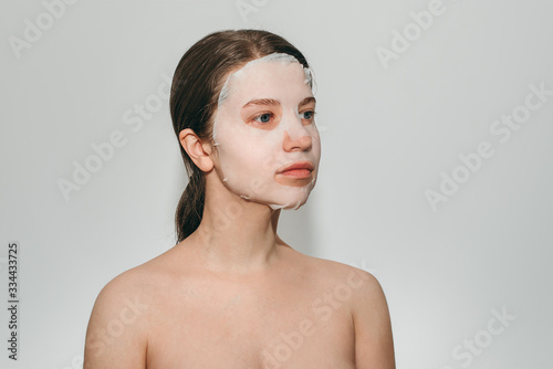 © lesia17, Obraz premium Portrait of young beautiful european woman with blue eyes with collagen silicone fabric with white mask on face on white background. Beauty treatments, the secret of youth, beauty, health.