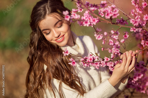 Fototapeta premium Portrait of young beautiful girl with perfect skin posing near blossom tree...