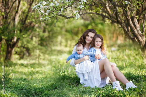Obraz premium Portrait of young beautiful mother with two daughters near blossoming tree. Mother, two daughters in a spring garden.