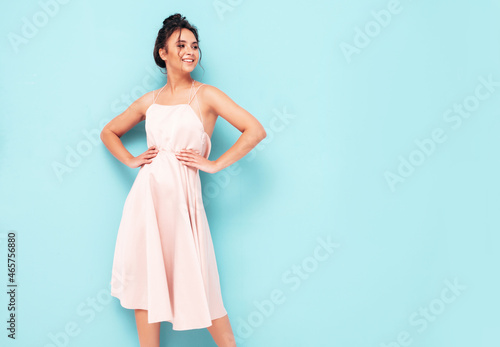 Naklejka premium Portrait of young beautiful smiling female in trendy summer dress. Sexy carefree woman posing near blue wall in studio. Positive model having fun indoors. Cheerful and happy