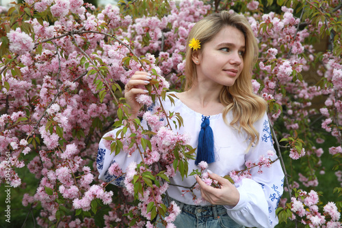 © Stanislav, Fototapeta premium Portrait of young blonde woman in blooming sakura garden in Ukrainian embroidered shirt.
