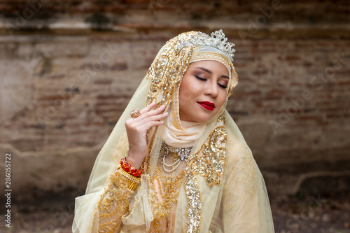 Fototapeta premium Portrait Of Young Bride Wearing wedding Hijab Standing and Looking Away
