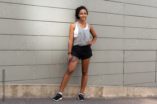 Fototapeta premium Portrait of young female athlete standing outdoors at wall