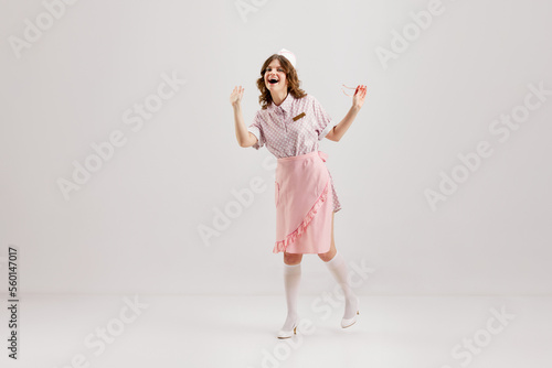 Naklejka premium Portrait of young female waitress, sensual woman in retro american fashion style of 70s, 80s in action motion over grey background.