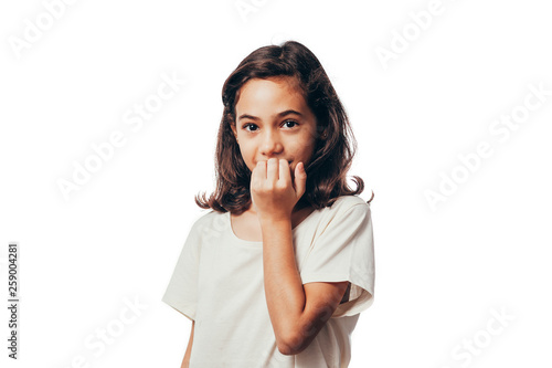 © kleberpicui, Fototapeta premium Portrait of young girl biting her nails on white background