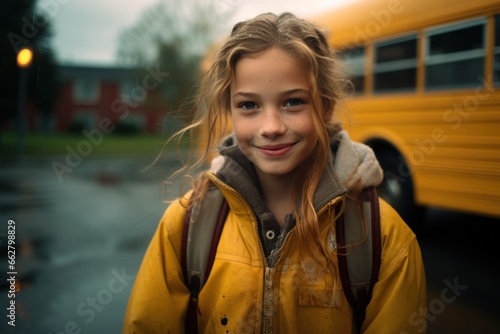 Fototapeta premium Portrait of young girls children and bus going back home looking forward...
