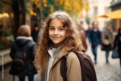 Fototapeta premium Portrait of young girls children and bus going back home looking forward...