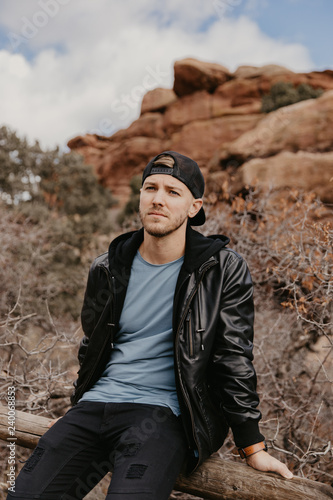 © MeganMahoneyPhotos, Naklejka premium Portrait of Young Good Looking Casual Traveling Handsome Man Smiling Near Ancient Desert Red Rocks in Jacket Outside